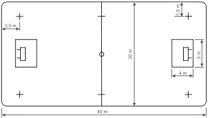 - Точки вбрасывания на центральной линии и на воображаемом продолжении линии ворот на расстоянии 1,5 м от соответствующих длинных сторон площадки. Они должны иметь форму креста, а их диаметр не должен превышать 30 см.