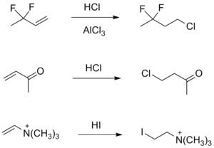 Вскоре после публикации правила Марковникова стали известны примеры, когда присоединение к алкенам достаточно простого строения приводило к неверному результату (анти-марковниковским продуктам) даже при низкой температуре. В то время, как эмпирическое правило Марковникова неспособно объяснить данные исключения, рассмотрение механизма позволяет достаточно просто показать, что образование таких продуктов согласуется с относительной устойчивостью карбокатионов[5].