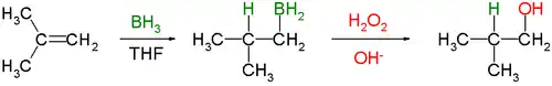 Позже стали применяться термины, описывающие образующиеся продукты или протекание реакции как марковниковские и анти-марковниковские, то есть совпадающие либо несовпадающие с предсказаниями правила Марковникова. Выражение «анти-марковниковский» обязано популярностью Г. Ч. Брауну, который при помощи данного слова подчёркивал синтетическую полезность реакций гидроборирования—окисления, дающих продукты, отличные от тех, что получались при обычной гидратации. Примечательно, что гидроборирование происходит именно в соответствии с расширенной формулировкой правила Марковникова, поскольку отрицательно заряженный атом водорода в молекуле борана присоединяется к менее гидрогенизированному атому углерода, и лишь последующая реакция окисления, приводящая к образованию спирта создаёт кажущийся парадокс несоответствия правилу Марковникова[6].