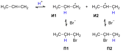 Реакция протекает в две стадии. На первой, медленной стадии происходит присоединение протона H+ к двойной связи: при этом протон может связываться с одним из двух атомов углерода, образующих двойную связь. Образующиеся карбокатионы И1 и И2 имеют различную энергию (устойчивость), поскольку положительный заряд в них делокализуется с разной эффективностью. По этой причине вторичный карбокатион И2 является более устойчивым, и соответствующий ему бромид П2 образуется в большем количестве.