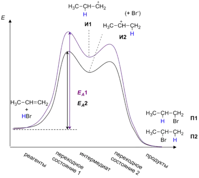 При более строгом рассмотрении необходимо сравнивать устойчивости не интермедиатов, а двух альтернативных переходных состояний на стадии образования карбокатионов, то есть энергии активации двух параллельных процессов. Для некоторых реакций различие этих величин достигает 25—30 кДж/моль[1].