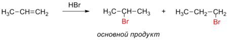 Когда несимметричный алкен соединяется с галогеноводородной кислотой, галоген присоединяется к атому углерода, содержащему меньше атомов водорода, то есть к атому углерода, на который больше влияют другие атомы углерода[2].