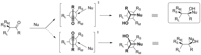 Согласно данной модели, стереоселективность реакции должна увеличиваться с увеличением заместителя R в кетонах, так как в этом случае траектория нуклеофила оказывается более приближенной к хиральному центру, увеличивая его влияние на стереоселективность. Например, триметилсилильная группа Si(CH3)3 по сравнению с атомом водорода даёт на порядок большую стереоселективность. При этом она может служить как вспомогательный заместитель, который можно легко удалить под действием фторид-иона[2]. Аналогично, в случае более крупных нуклеофилов стереоселективность увеличивается, поскольку крупные нуклеофилы более чувствительны к различию размеров между RM и RS. В связи с этим, полезным оказался подход, предполагающий использование более крупных противоионов нуклеофила для повышения селективности реакции (например, (C2H5)4Pb вместо C2H5MgBr)[1].