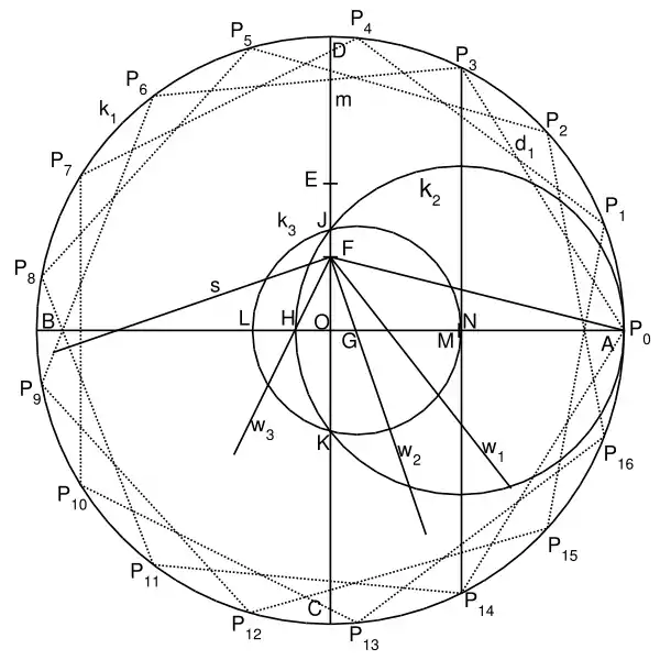 Точки пересечения этой касательной с исходной окружностью k₁ — это точки P₃ и P₁₄ искомого семнадцатиугольника. Если принять середину получившейся дуги за P₀ и отложить дугу P₀P₁₄ по окружности три раза, все вершины семнадцатиугольника будут построены.