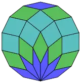 По Коксетеру любой 2m-угольный зоногон можно разбить на m(m-1)/2 ромбов. Для правильного четырнадцатиугольника m=7 и его можно разбить на 21 ромб — на 3 набора по 7 ромбов. Это разбиение основано на проекции многоугольника Петри гептеракта с 21 из 672 граней[5]. Список A006245 даёт число решений 24698, включая вращения и хиральные формы.
