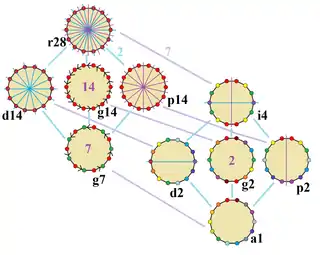 Справа на рисунке можно видеть 10 симметрий четырнадцатиугольника. Конвей использовал для обозначения симметрий буквы вместе с порядком группы[1]. Полная симметрия правильной фигуры будет равна r28, а отсутствие симметрии отмечается как a1. Диэдральные симметрии делятся по тому, проходят они через вершины (используется буква d, от «diagonal») или через середины сторон (используется буква p, от «perpendicular»). Если же оси симметрии проходит через вершины и середины сторон, используется буква i. Циклические симметрии помечаются буквой g (от «gyration»). Каждая подгруппа симметрии допускает одну или более степеней свободы для неправильных форм. Только подгруппа g14 не даёт свободы, но стороны многоугольника могут рассматриваться как имеющие направление.