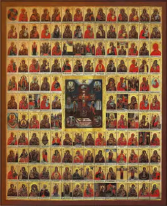 В календаре Русской православной церкви упоминается около 260 чтимых и чудотворных икон Богородицы, вообще же можно насчитать более 800 наименований икон[15]. Для большинства икон установлены отдельные дни празднования, им написаны молитвы, тропари, кондаки, иногда акафисты. Другие изводы, главным образом в XVII—XVIII веках, складывались под западноевропейским влиянием, например, тип Богоматери Вертоград, Богоматери Виленской, Балыкинской, Богоматери Платитеры. Ещё один иконографический источник — западноевропейские гравюры, в частности собрания Киево-Могилянской академии и типографии Киево-Печерской лавры.[19]