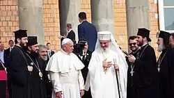 На фоне осложнения православно-католических отношений в начале 1990-х годов Элладская церковь заняла активную позицию. В феврале 1992 года Священный синод Элладской православной церкви обвинил католиков в использовании Восточнокатолических церквей для экспансии в православных странах, а также призвал греческое правительство разорвать дипломатические отношения с Ватиканом[269]. В 2001 году папа Иоанн Павел II посетил Грецию. Представители общественности, иерархов, монахов и верующих Элладской православной церкви выразили протест и призвали греческое правительство отменить визит понтифика. В ходе визита предстоятель Элладской церкви Христодул отметил, что протесты части православной паствы является проверкой «очищения исторической памяти», к которой призывал папа. Иоанн Павел II попросил прощения у греческого народа за действия крестоносцев[82] и признал «груз противоречий прошлого и настоящего», который необходимо преодолеть. По итогам визита, иерархи подписали совместную декларацию, в которой предстоятели церквей осудили «любое применение насилия, прозелитизма и фанатизма во имя религии», а также выразили беспокойство в связи с вызовами современности: социальной несправедливостью, войнами, терроризмом и насилием в мире[144][270]. В 2006 году Христодул подписал вторую совместную декларацию с папой Бенедиктом XVI[271]. В 2016 году папа Франциск посетил Грецию[197]. В апреле 2016 года предстоятель Элладской церкви Иероним II в лагере для беженцев на Лесбосе, совместно с константинопольским патриархом Варфоломеем и папой римским Франциском, подписал очередное совместное православно-католическое заявление[272].