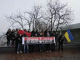 «Правый сектор» (укр. Правий сектор) — изначально неформальное объединение активистов ряда украинских националистических («национально ориентированных») ультраправых организаций[5][6][7], образовавшееся в ходе протестных акций в Киеве (декабрь 2013 — февраль 2014 гг.)[8]. Первую известность получило своим участием 1 декабря 2013 года в столкновениях с внутренними войсками и спецподразделениями МВД Украины, охранявшими здание Администрации президента[8], а также в захвате нескольких административных зданий[9] — один из этажей захваченного Дома профсоюзов они и занимали в ходе Евромайдана[9]. В Российской Федерации «Правый сектор» признан экстремистской организацией[10], его деятельность запрещена.