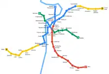| Линия «В» | Жёлтый | 1985 | 2001 | Зличин ↔ Черни-Мост | 25,6 км (16 миль)[3] | 24 |