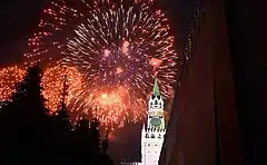 В Москве главный военный Парад Победы был проведён на Красной площади 9 мая 2015 года[47]. Начало в 10:00 по московскому времени. В параде приняли участие свыше 15 тысяч военнослужащих, в том числе 1,3 тысяч иностранных военных. Приняли участие 194 единицы бронетехники и 143 самолёта и вертолёта. Также, были представлены элементы новой экипировки военнослужащих «Ратник»[48].