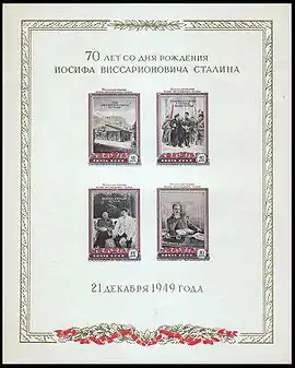 Первым и единственным коммеморативным выпуском, который был посвящён персонально лидеру Советского Союза, стал почтовый блок 1949 года «К 70-летию Сталина» (ЦФА [АО «Марка»] № 1483).[4] Блок был издан тиражом 1 млн экземпляров и включал четыре неперфорированные марки, на которых были изображены дом в Гори, где родился Сталин, Ленин и Сталин в Смольном в октябре 1917 года и в Горках, а также индивидуальный портрет Сталина в кремлёвском кабинете. Блок был подготовлен художником Р. Житковым и отпечатан на белой бумаге (с золотой и бронзовой рамкой), а также на кремовой и жёлтой бумаге. Он стал самым крупным почтовым блоком в СССР; его размеры составили 175 × 220 мм. Данный блок также относился к числу филателистической продукции советского периода (ок. 100 единиц), которые не были разрешены к вывозу из СССР и России[5].
