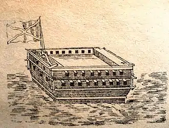 Крупное плоскодонное парусно-гребное трехмачтовое судно. На прамы устанавливалась мощная артиллерия, располагавшаяся в закрытой батарее, и состоявшая в различное время от 18 до 44 пушек крупного калибра. Иногда на прамы устанавливались гаубицы, единороги и мортиры. За счёт малой осадки могли использоваться на мелководье[10]. При этом отличались плохой манёвренностью и практически не могли двигаться без помощи буксира[11][12].