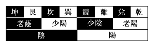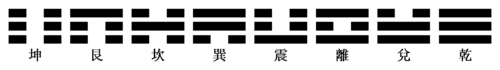 Цянь, Дуй, Ли, Чжэнь, Сюнь, Кань, Гэнь, Кунь (乾, 兌 (兑), 離, 震, 巽, 坎, 艮, 坤).