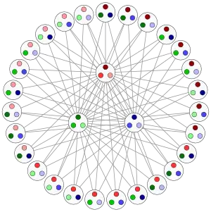 Более обще, пусть q будет положительным целым числом, а G будет полным двудольным графом . Пусть допустимые цвета представлены различными двузначными числами в системе radix q (то есть, в q-ричной системе). Одной доле, а именно доле с q вершинами, пусть даны множества цветов s , в которых первые знаки равны для каждого выбора из q возможностей выбора цифры i. Другой доле графа с вершинами задаются цвета , для которых первая цифра различна для любого набора из q элементов. Иллюстрация показывает пример такого построения с q = 3.