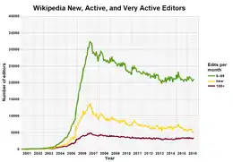 Анализ тенденций, касающихся данных, обнародованных Викимедиа, гласит: «Число редакторов англоязычного раздела за семь лет сократилось на треть.»[21] Степень убыли активных редакторов английской Википедии была заявлена The Economist как существенная в отличие от статистики Википедии на других языках (неанглийская Википедия). The Economist сообщает о том, что количество участников Википедии на других языках со средним числом от пяти и более правок за месяц с 2008 года было относительно постоянным при приблизительно 42 000 редакторов в границах узких сезонных колебаний около 2 000 редакторов вверх или вниз.