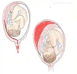 При отслойке небольшого участка плаценты может образоваться ретроплацентарная гематома. В этом случае сосуды матки тромбируются и прогрессирование отслойки плаценты прекратится. В ряде случаев кровь пропитывает маточную стенку при значительной отслойке плаценты и большом размере ретроплацентарной гематомы. В этих случаях сократительная деятельность миометрия нарушается. Если происходит краевая отслойка плаценты, то кровь проходит между плодными оболочками и маточной стенкой, тогда наблюдаются симптомы наружного кровотечения, так как кровь изливается во влагалище. Кровь из половых путей сразу после отслойки плаценты алая. Темный цвет свидетельствует о промежутке времени, прошедшем с момента отслойки до начала кровотечения. Преждевременная отслойка плаценты может быть легкой и тяжелой формы.
