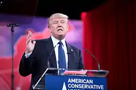 Трамп отличается популистской позицей по отношению к нелегальной миграции. Желание приостановить несправедливые, по его мнению, торговые соглашения и военные интервенции[1][2][3][4][5] принесло ему особую поддержку среди «синих воротничков»[6]. В итоге, Трамп стал главным претендентом на выдвижение в президенты от Республиканской партии[7][8][9][10][11]. Некоторые мировые лидеры выразили обеспокоенность по поводу его перспективы стать президентом[12][13].