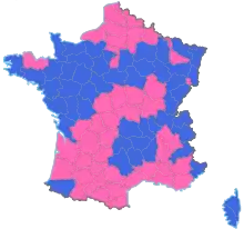 Результаты второго тура по департаментам Франции: синий — Валери Жискар д'Эстен; розовый — Франсуа Миттеран