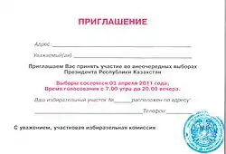 - В избиркомы в день голосования на президентских выборах в РК поступило всего 8 обращений граждан. ИА Новости-Казахстан (5 апреля 2011). Дата обращения: 29 мая 2011. Архивировано 20 августа 2011 года.