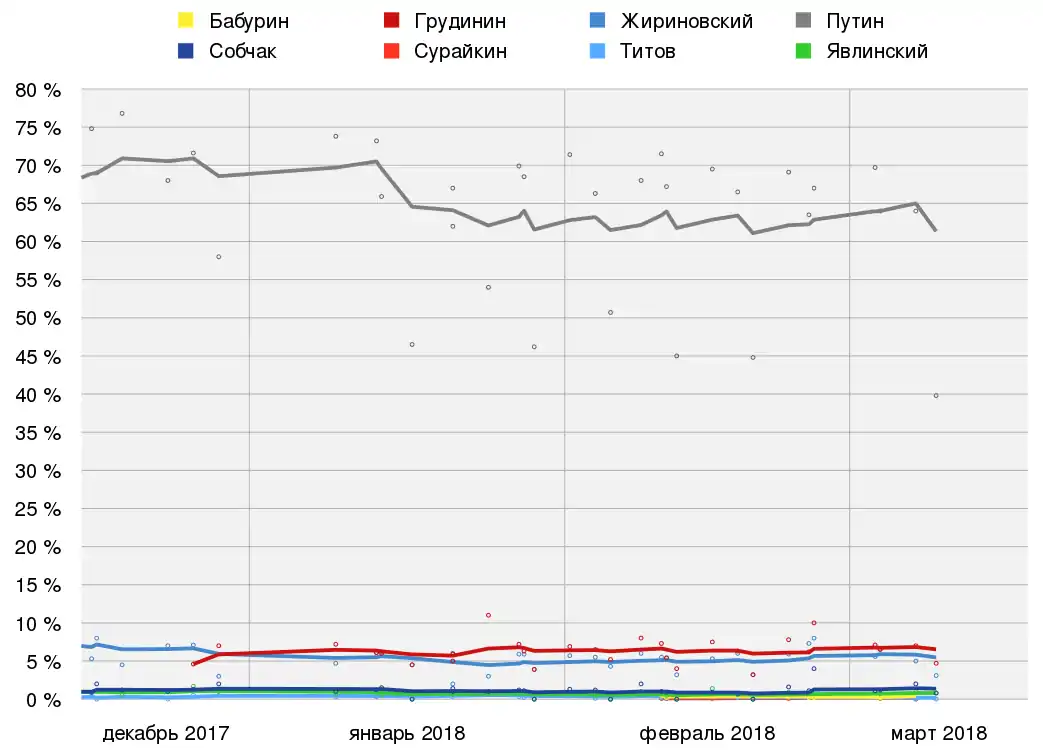 До участия в выборах ЦИКом было допущено восемь кандидатов: Сергей Бабурин (выдвинут «Российским общенародным союзом»), Павел Грудинин (выдвинут КПРФ), Владимир Жириновский (выдвинут ЛДПР), Владимир Путин (выдвинут инициативной группой в порядке самовыдвижения), Ксения Собчак (выдвинута «Гражданской инициативой»), Максим Сурайкин (выдвинут от партии «Коммунисты России»), Борис Титов (выдвинут «Партией Роста»), Григорий Явлинский (выдвинут партией «Яблоко»)[8].