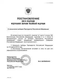 15 декабря 2017 года Совет Федерации официально назначил дату выборов — на 18 марта 2018 года[20][21].