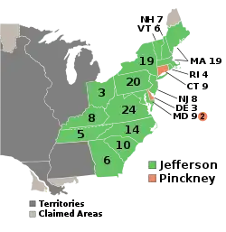Джефферсон номинировал губернатора из Нью-Йорка Джорджа Клинтона в качестве кандидата в вице-президенты, который заменил Аарона Бурра. Федералисты выбрали Чарльза Пинкни и Руфуса Кинга как своих кандидатов. Однако, критика политики Джефферсона оказалась бесплодной и он победил с огромным отрывом, опередив федералистов даже в штатах Новой Англии, считавшейся оплотом федералистов.