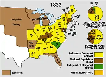 На президентских выборах в США 1832 года президент Эндрю Джексон легко одержал победу над претендентом от Национальной республиканской партии Генри Клэем, получив 219 голосов выборщиков из 286 возможных.
