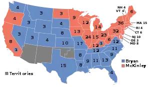Половина голосов была в 8 штатах: Нью-Йорке, Нью-Джерси, Пенсильвании, Огайо, Индиане, Иллинойсе, Мичигане и Висконсине. Все они были выиграны Мак-Кинли. Мак-Кинли победил с большим отрывом на Северо-востоке, а Брайан — на Юге и горном Западе. Это были последние выборы, в которых демократы побеждали в Южной Дакоте до 1932 года, последние, в которых демократы побеждали в Юте и Вашингтоне до 1916 года, последние, в которых демократы побеждали в Канзасе и Вайоминге до 1912 года, и последние, в которых демократы побеждали в Небраске до 1908 года. Это также единственные выборы, в которых республиканцы победили без Южной Дакоты, Канзаса, Юты и Вайоминга с их становления штатами.