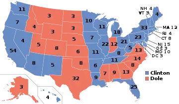 | Роберт Доул/Джек Кемп | Республиканская партия | 39 198 755 | 40,7 % | 159 |