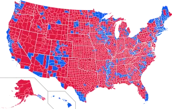 Победивший кандидат в округе на президентских выборах 2004; синий цвет — округа, в которых победил демократический кандидат Джон Керри, красные — республиканский кандидат Джордж Буш-младший.