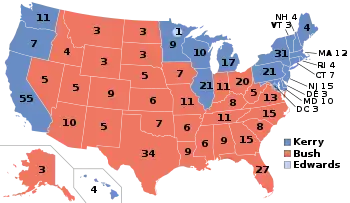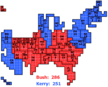 ![]() Распределение голосов выборщиков на президентских выборах 2004; синий цвет — штаты, в которых победил демократический кандидат Джон Керри, красные — республиканский кандидат Джордж Буш-младший; цифры обозначают количество голосов выборщиков от каждого штата. | |||