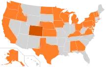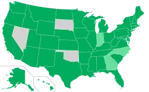 Только write-in: Алабама, Аризона, Коннектикут, Делавэр, Джорджия, Иллинойс, Индиана, Канзас, Кентукки, Мэн, Мэриленд, Монтана, Небраска, Нью-Гэмпшир, Нью-Йорк, Огайо, Орегон, Род-Айленд, Теннесси, Техас, Вермонт, Виргиния[34][36][37].