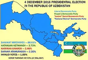 | Результат выборов | Шавкат Мирзиёев избран президентом Республики Узбекистан на первый срок по итогам первого тура | ||