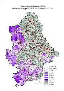 Наиболее высокая явка наблюдалась в западных и центральных областях Украины (без восьми юго-восточных областей), где она составила 67,15 %. Самой низкой стала явка жителей шести юго-восточных (без Донецкой и Луганской) областей Украины — 50,72 %. В Донецкой и Луганской областях голосование было ограничено в связи с позицией руководства самопровозглашённых Донецкой Народной Республики и Луганской Народной Республики[15] и идущего с апреля 2014 года вооружённого конфликта на территории этих областей.
