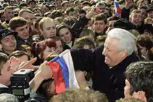 Весной 1991 года, будучи Председателем Верховного Совета РСФСР и кандидатом в президенты России, Ельцин в рамках приуроченной к выборам деловой поездки по России посетил Чечено-Ингушетию. Он в общих чертах выразил поддержку суверенитету республики, повторив свой известный тезис: «Берите столько суверенитета, сколько сможете понести»[128]. В отдельных автономиях это восприняли как призыв к действию. В июле 1991 года мятежный генерал Джохар Дудаев провозгласил независимую Чеченскую Республику (Нохчи-Чо)[43].