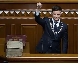 20 мая 2019 года в здании Верховной рады Украины состоялась церемония инаугурации, в ходе которой Владимир Зеленский принял присягу в качестве главы государства. Слова присяги он произносил, положив руку на Конституцию Украины и Пересопницкое Евангелие. Президентское удостоверение Зеленскому вручила председатель Центральной избирательной комиссии Татьяна Слипачук. Также он получил символы президентской власти: печать, булаву, а также нагрудный знак в виде цепи с гербовыми медальонами.