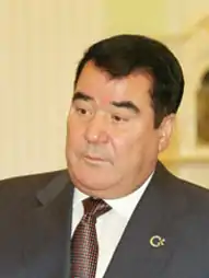 - Титул «Туркменбаши» (дословный перевод — глава туркмен[1]), позже «Туркменбаши Великий», присвоен Сапармурату Ниязову официально, постановлением Меджлиса (парламента). Также в большом ходу были неофициальный титул «сердар» (вождь, главком) и многочисленные пышные эпитеты.