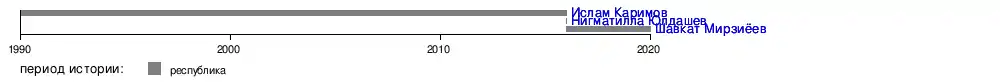 - Ислам Каримов находился во главе Узбекистана фактически с 23 июня 1989 года, когда был избран первым секретарём ЦК Компартии Узбекистана; с 31 августа 1991 года — президент независимой Республики Узбекистан