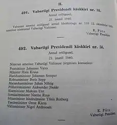 В период советской власти за пределами СССР также действовало правительство Эстонской Республики в изгнании, глава которого официально назывался «премьер-министром, временно исполняющим обязанности Президента Республики». Однако легитимность правительства в изгнании ставится некоторыми историками под вопрос, поскольку, по их утверждению, оно не было официально признано ни одним государством мира. Первое правительство Эстонии в изгнании состояло из лиц, назначенных последним премьер-министром независимой Эстонии Юри Улуотсом (после предъявления Советским Союзом ультиматума, включавшего требование о формировании дружественного СССР правительства Эстонии, 21 июня 1940 года кабинет министров Улуотса был отправлен в отставку указом президента Константина Пятса). Подчиняясь советскому ультиматуму, президент Пятс назначил новое правительство во главе с Йоханнесом Варесом Барбарусом.
