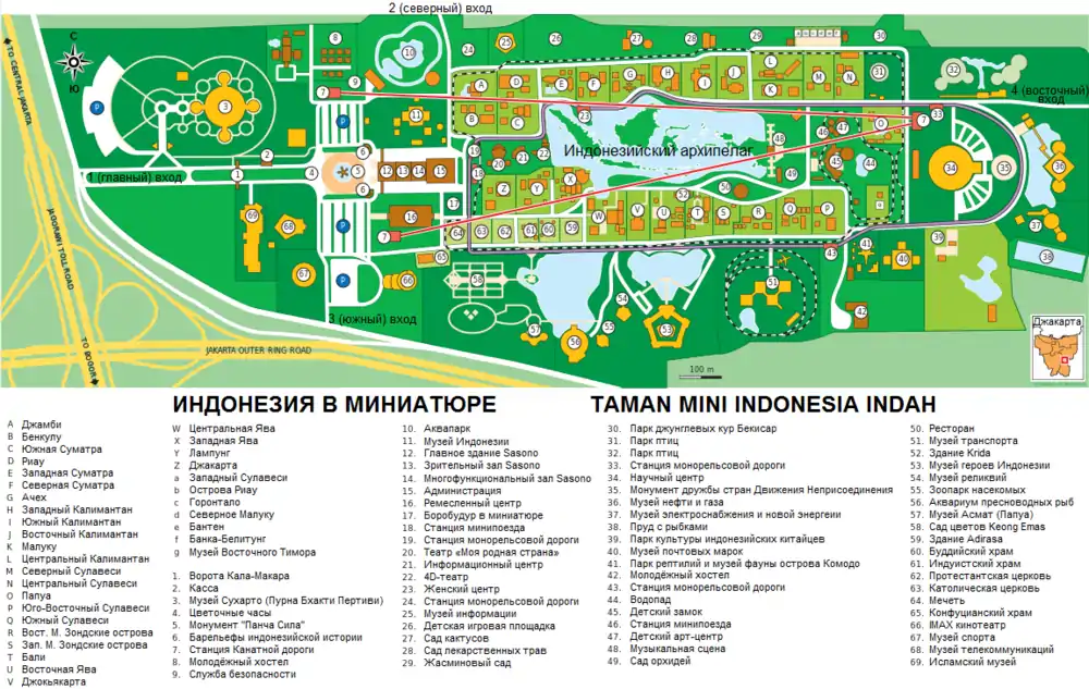 Центральную часть парка занимает искусственное озеро, воспроизводящее в миниатюре географическую карту Индонезии со всеми островами. Над озером проложена канатная дорога, откуда можно полюбоваться на Индонезийский архипелаг с высоты птичьего полёта. Имеется также возможность проплыть по озеру между островами, воспользовавшись лодкой или катамараном. По огромной территории парка можно перемещаться на велосипеде, взятом напрокат, а также на электромобиле, монорельсовом поезде и пешком.