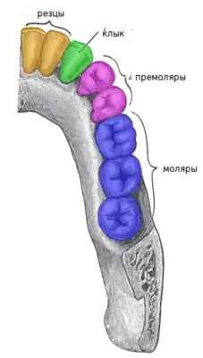 ![]() Коренные зубы правой половины нижней зубной арки. Вид сверху. | |