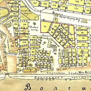 - Дома № 16. Дом купца Лапшина. Дом принадлежал купцу Василию Лапшину. В нём располагалась контора правления пароходного товарищества «Русь». В 1986 году дом был разрушен, и на его фундаменте был построен новый дом «под старину»[11]. Сегодня в этом здании располагается департамент муниципального имущества Волгограда[9][10].