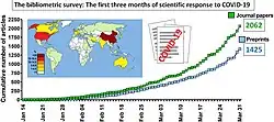 Пандемия COVID-19 привела к всплеску научных работ по различным аспектам вируса. Так, весной 2020 года только в журнал The New England Journal of Medicine поступало 110—150 статей ежедневно[67]. Для ускорения процесса обмена научными данными издатели значительно снизили выделяемое на рецензии время для рукописей по COVID-19. Однако несмотря на то, что в среднем время между отправкой и публикацией статьи сократилось на 49 %, полный процесс издания научной работы по-прежнему составлял минимум 4—5 недель[30][68][69]. Это привело к повышению популярности препринтов, делающих работы доступными в течение 24—48 часов с момента загрузки на сайт. Из 30 260 научных статей про COVID-19, вышедших в первые десять месяцев после начала пандемии, более 25 % были изначально опубликованы в виде препринтов. Только за лето 2020 года на сервере MedRXiv количество опубликованных препринтов увеличилось на 400 % по сравнению с тем же периодом 2019-го[70]. При этом увеличилось количество читателей и уровень доверия к неотрецензированным работам — препринты по COVID-19 просматривали в 18,2 раза чаще и загружали в 27,1 раз чаще, чем препринты по другим темам, опубликованные за тот же десятимесячный период. Одновременно с этим новостные СМИ, включая BBC, начали активно ссылаться на препринты для освещения актуальных исследований по вирусу[71][72], а Всемирная организация здравоохранения и Европейский центр профилактики и контроля заболеваний использовали исследования, опубликованные в форме препринтов, для принятия отдельных политических решений и подготовки стратегических документов во время пандемии[71]. Всего COVID-19 было посвящено около 4 % всех научных публикаций, вышедших в 2020 году[73].