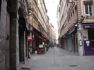 Улица Мерсьер (фр. Rue Mercière) — старинная лионская улица, известная ещё с галло-римских времён. Первоначально шла с запада на восток, но в Средние века изменила направление и стала параллельна течению Соны. В XVI веке именно на этой улице расположил свою мастерскую лионский первопечатник Бартелеми Бюйе, а следом и его коллеги, благодаря чему на целые 100 лет Лион стал одним из центров европейского книгоиздания (наряду с Венецией и Парижем). К середине XVIII века узость улицы Мерсьер затрудняет исполнение ею транспортных функций, но лишь к 1850 году по соседству пробивают более просторную улицу Сантраль (сегодня — улица Брест). В результате многие коммерсанты покидают улицу Мерсьер и переезжают на улицу Сантраль, а потом и восточнее — на улицы Империаль (ныне Репюблик) и Императрис (ныне Президан Эдуар Эрио). Улица приходит в запустение, появляются многочисленные планы переустройства (фактически сноса) улицы: в 1909 году первый план не окончен, в 1925 году появляется другой, предусматривающий строительство нового квартала с 50-этажной башней в центре — он также не реализован. В 1960-х годах, когда репутация улицы Мерсьер окончательно портится — она заполнена злачными местами с проститутками — принимается окончательный план сноса улицы. Однако жители начинают протестовать и обращаются к министру культуры Андре Мальро, который добивается получения улицей и всем кварталом статуса охраняемых. Принимается план возрождения улицы Мерсьер, подобный тому, что ранее был подготовлен для Старого Лиона, что способствует её возрождению. Сейчас бо́льшая часть улицы — пешеходная, здесь расположились многочисленные ресторанчики. Сегодня путеводители называют улицу одним из центров лионской гастрономии[33].