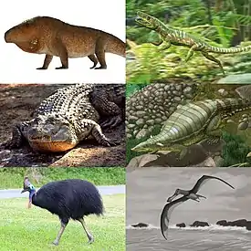 Крупнейшие наземные животные принадлежали к динозаврам — древним рептилиям, в настоящее время представленным только птицами. Рептилии пережили расцвет в эпоху мезозоя, когда они доминировали на суше, в море и в воздухе. В конце мелового периода большая часть рептилий, особенно крупного размерного класса, вымерла. Однако бытующее мнение, что современные пресмыкающиеся являются лишь разрозненными остатками того древнего мира, неверно. Сейчас на Земле обитает около 11 570 видов нептичьих пресмыкающихся, большая часть которых относится к отряду чешуйчатых[5], на территории России обитает 77 видов[6][7]. Вымершие динозавры дали начало процветающей в настоящее время группе животных — птицам, причём многие приспособления, обусловившие эволюционный успех этой группы, появились ещё у её архозавровых предков, представлявших собой специализированную группу диапсидов (теплокровность, теплоизолирующий покров тела — перья, развитый головной мозг, и так далее).