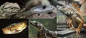 ![]() 1-й ряд: синайская агама, геккон токи, комодский варан; | |||||||||||||||||||||||||||||||||||||||||