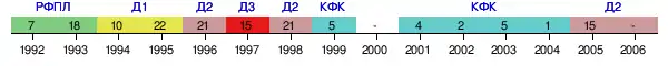 | 1997 | Третья лига | 3 | 15 из 21 | 40 | 14 | 3 | 23 | 50-77 | 1/128 | Арсенал (Тула) 3:4 (д) | Реорганизация первенства. Переход во второй дивизион |