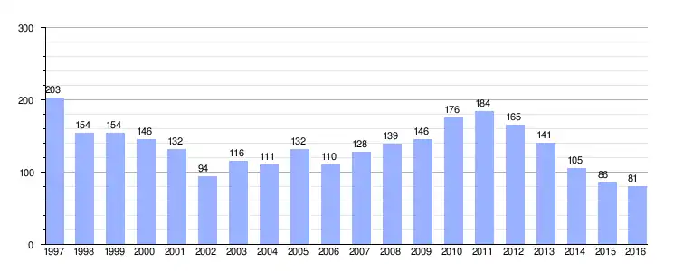 | Число убийств в Греции по годам с 1997 по 2016 |