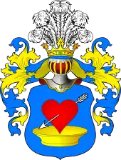 - В поле червлёном сердце, пронзенное двумя опрокинутыми стрелами в Андреевский крест и сопровождаемое сверху золотым кавалерским крестом.. Последнего вида герб был у украинского гетмана П. Л. Полуботка.
